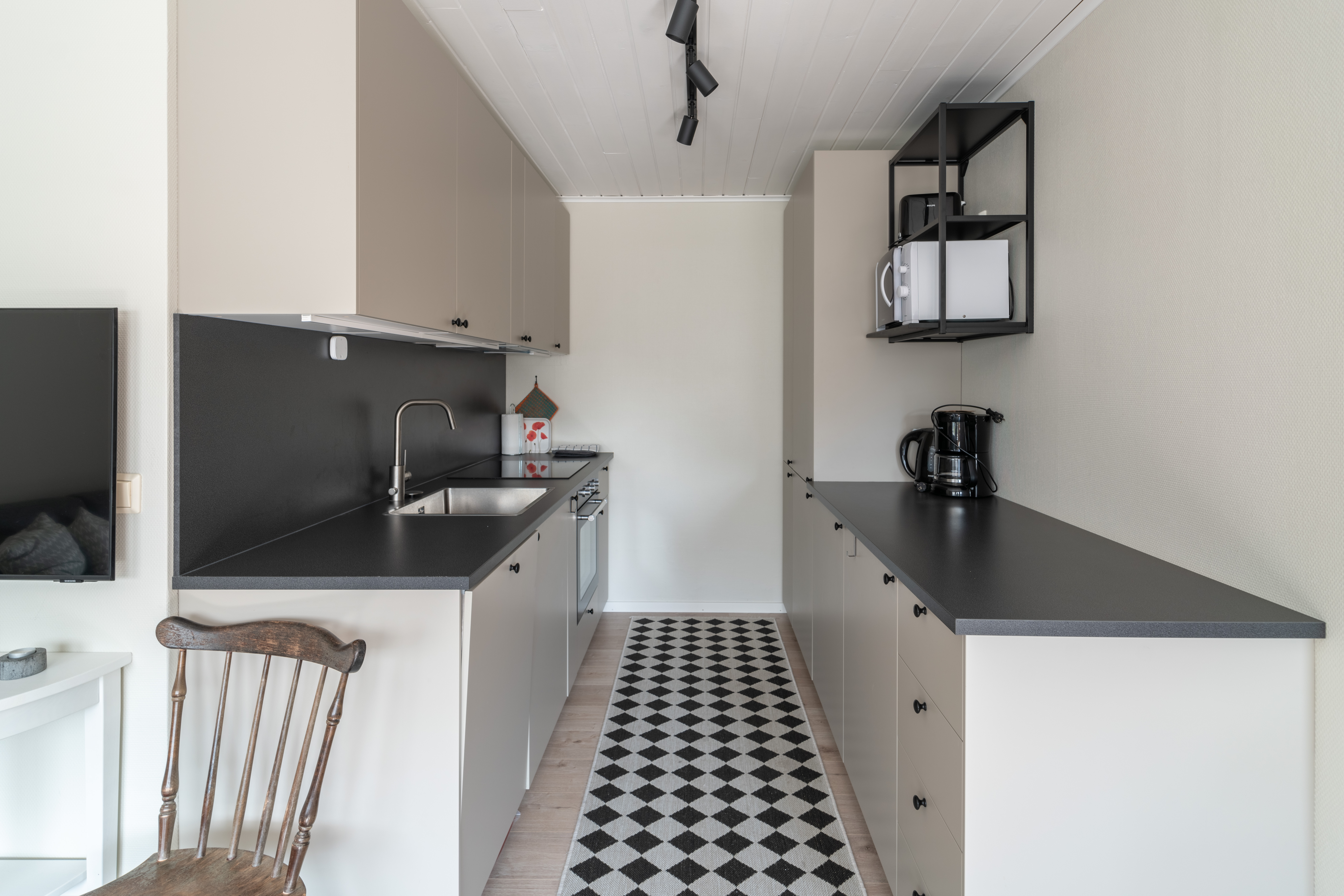 1 sovrum med 1 dubbelsäng och 1 sovrum med 2 våningssängar. Kombinerat kök/vardagsrum. Badrum med dusch och toalett. Kyl/frys, kaffebryggare, vattenkokare, brödrost, mikrovågsugn och TV.